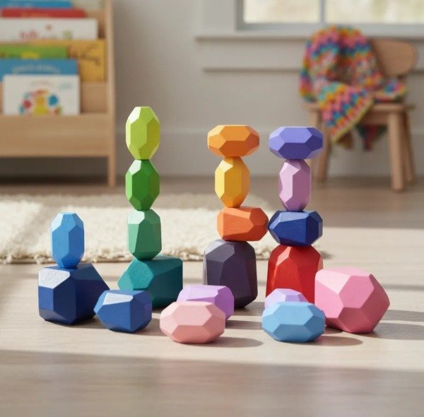 🌱 Este juego acompaña el ritmo natural del desarrollo infantil, respetando los tiempos, intereses y capacidades de cada etapa. No hay una única forma de jugar: las piedras pueden apilarse, clasificarse por color o tamaño, usarse como personajes o elementos de una historia, o simplemente manipularse por el placer de sentir su forma en las manos.