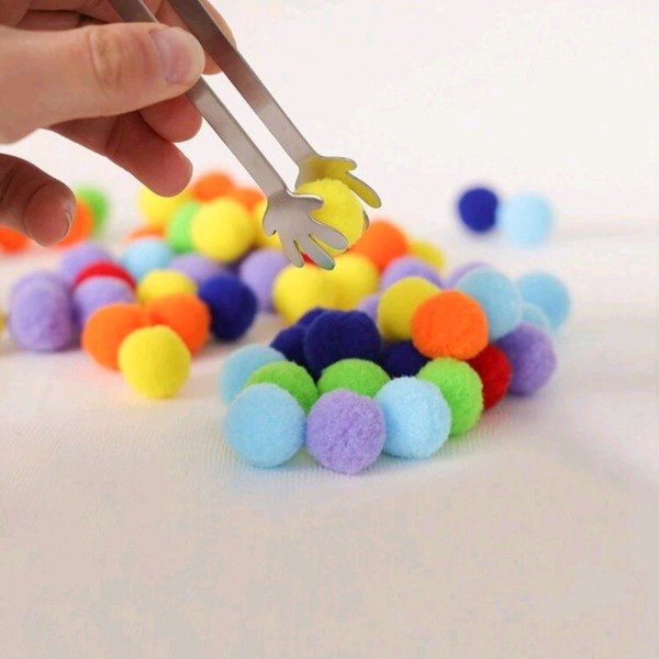 - Coordinación ojo-mano y motricidad fina, al tomar cada pelotita con la pinza y ubicarla en su contenedor correspondiente